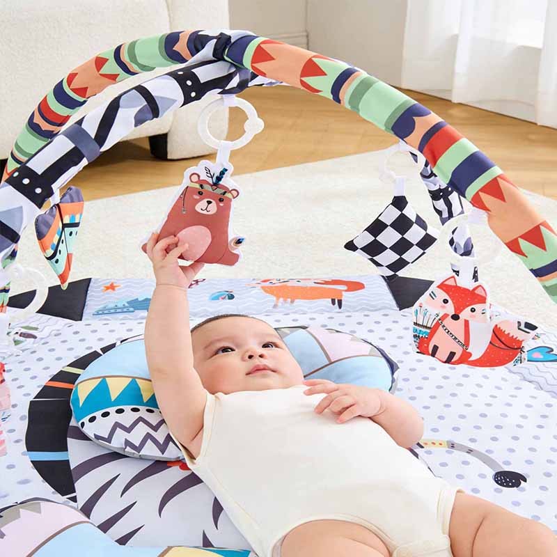 Tiny Paws 4-in-1 boho hexagon play gym with tummy pillow. 5 sensory toys (bell, squeaker, crinkle, safety mirror). Folds into playpen or ball pit. For 0-36 months. Wholesale & OEM available.
