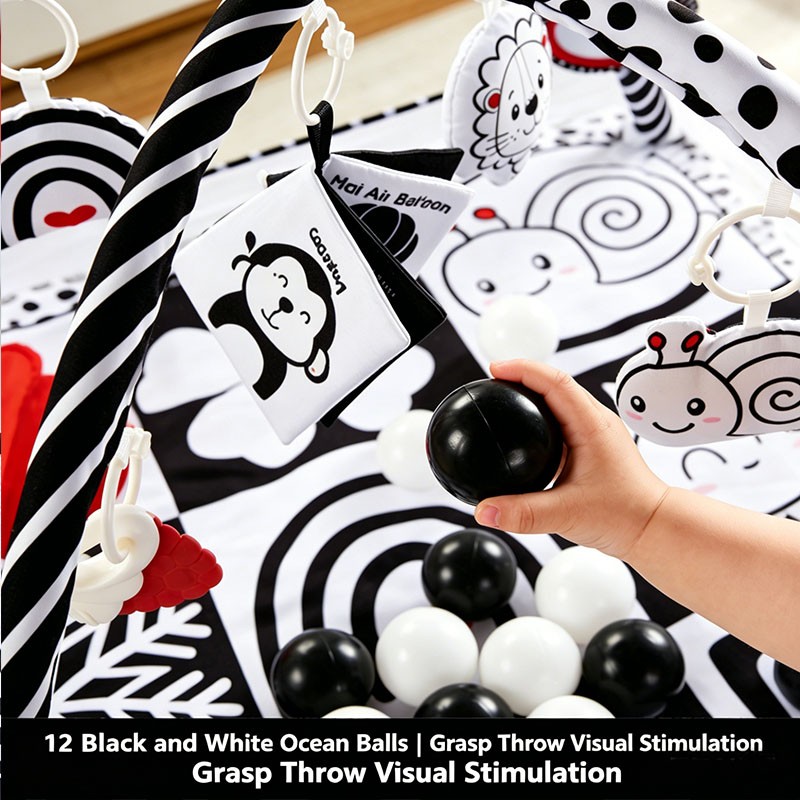 Designed for newborns to 18 months, this apple crinkle black & white play mat features a square 80x80cm base with a foldable mesh fence. Includes 6 interactive hanging toys and 12 black-white ocean balls. The fence can be raised for ball pit mode or folded flat for mat mode. Perfect for wholesale buyers and brands seeking OEM customization.