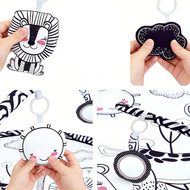 Designed for newborns to 12 months, this high contrast black white forest animal round play gym features a soft peach skin mat (85cm diameter) and 2 detachable arches. Includes 4 interactive toys: lion bell, black cloud crinkle, bear squeaker, sun teether, plus a safety mirror. Perfect for wholesale buyers and brands seeking OEM customization.