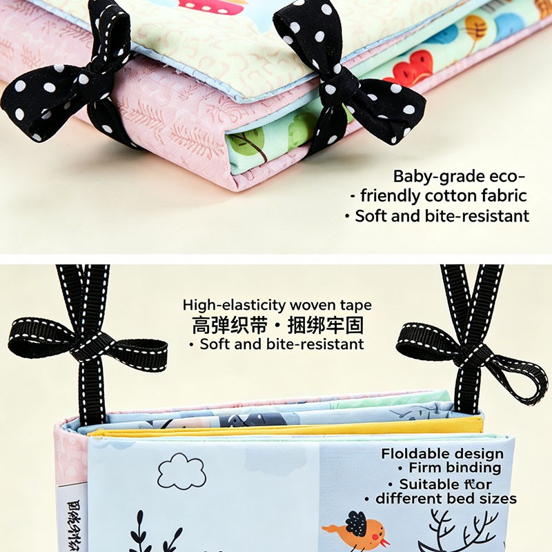 Tiny Paws forest animal crib bumper & cloth book. 90x15cm, double-sided (color + black-white). Features: crinkle tree, squeaker hippo, safety mirror.