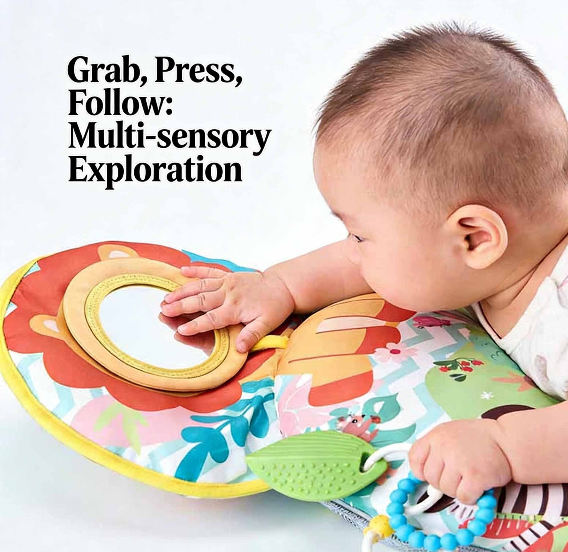 Fine motor skills – Grasping teether, pressing crinkle mat, and touching the mirror build hand-eye coordination and dexterity.
