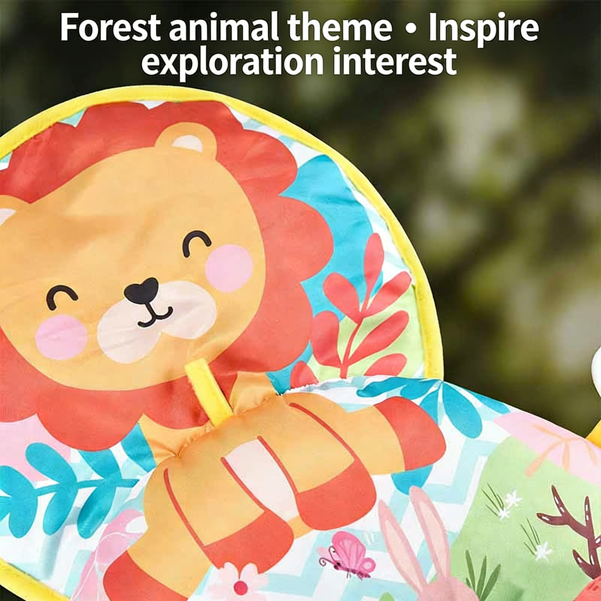 Adorable Forest Animal Theme – Front round mat features a large cartoon lion. Pillow body prints deer, zebra, squirrel, tropical plants, flowers, and geometric patterns. Soft, gentle colors for visual stimulation.