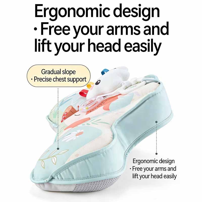 Designed for newborns to 6 months, this ergonomic tummy time pillow features a gradual slope to support baby's chest and free the arms for easy head lifting. Made of soft, skin-friendly fabric with high-elastic PP cotton fill. Includes 3 detachable sensory toys. Perfect for wholesale buyers and brands seeking OEM customization.
