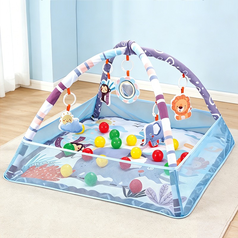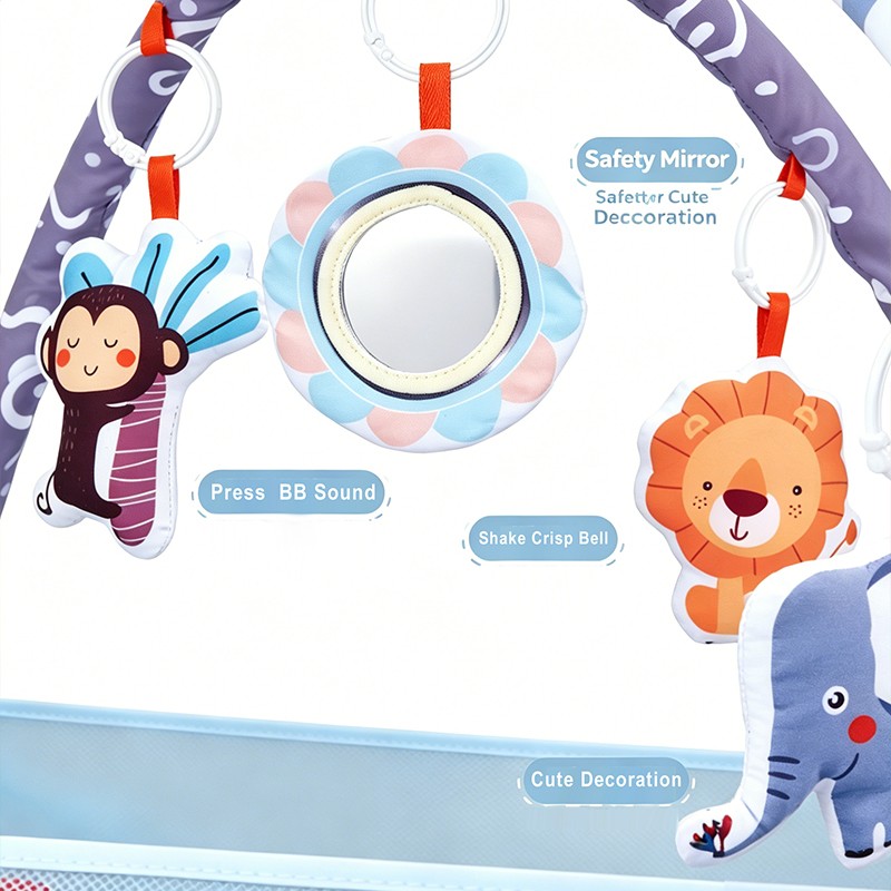 Designed for newborns to 12 months, this fresh blue forest animal 2-in-1 play gym and ball pit features a square mat with breathable mesh fence (foldable) and 2 pastel striped arches. Includes 5 interactive hanging toys: elephant squeaker, lion bell, cloud soft touch, monkey bell, and a safety mirror. Perfect for wholesale buyers and brands seeking OEM customization.