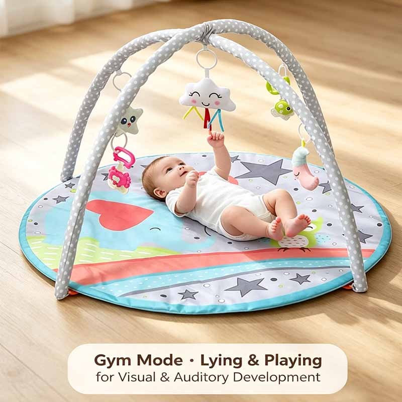 Visual stimulation – High-contrast grey dots, stars, and colorful animal prints enhance focus.