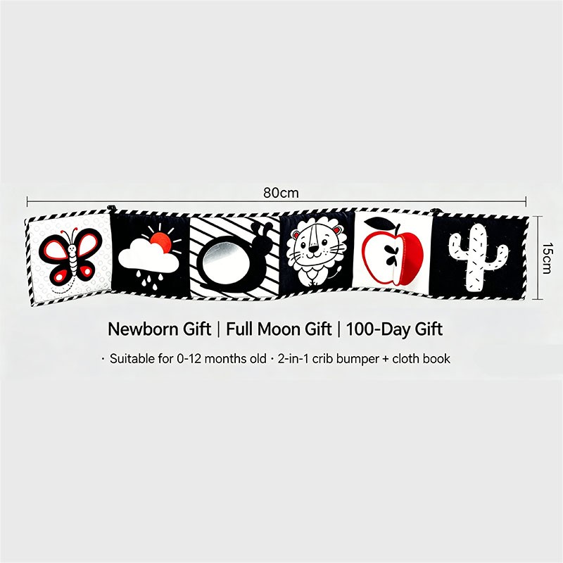 Designed for newborns to 12 months, this double-sided crib bumper and cloth book measures 80x15cm. The front features high-contrast black-white-red animal prints with an apple crinkle flap, snail safety mirror, and built-in squeaker. The reverse side offers black-white geometric patterns for early visual stimulation. Perfect for wholesale buyers and brands seeking OEM customization.