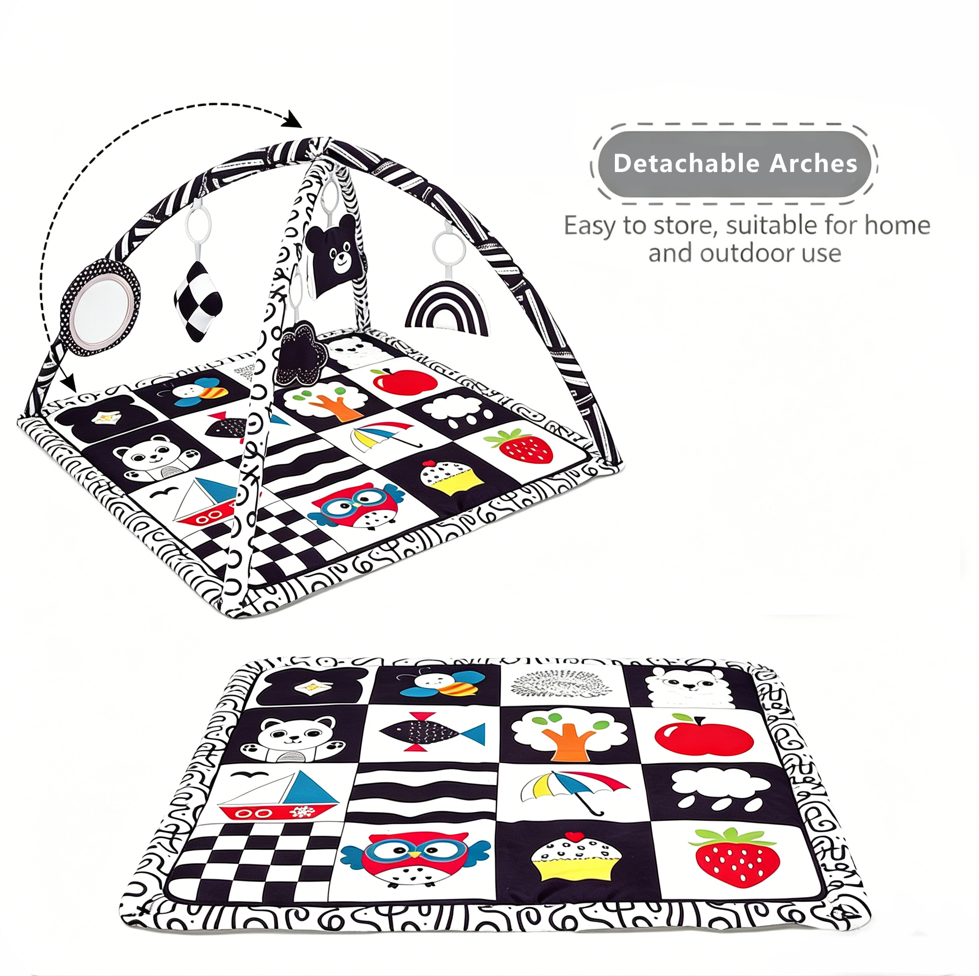 Black-white checker peach skin mat (85cm), 2 arches. 5 toys: geometric bell, black cloud crinkle, bear squeaker, rainbow, mirror.