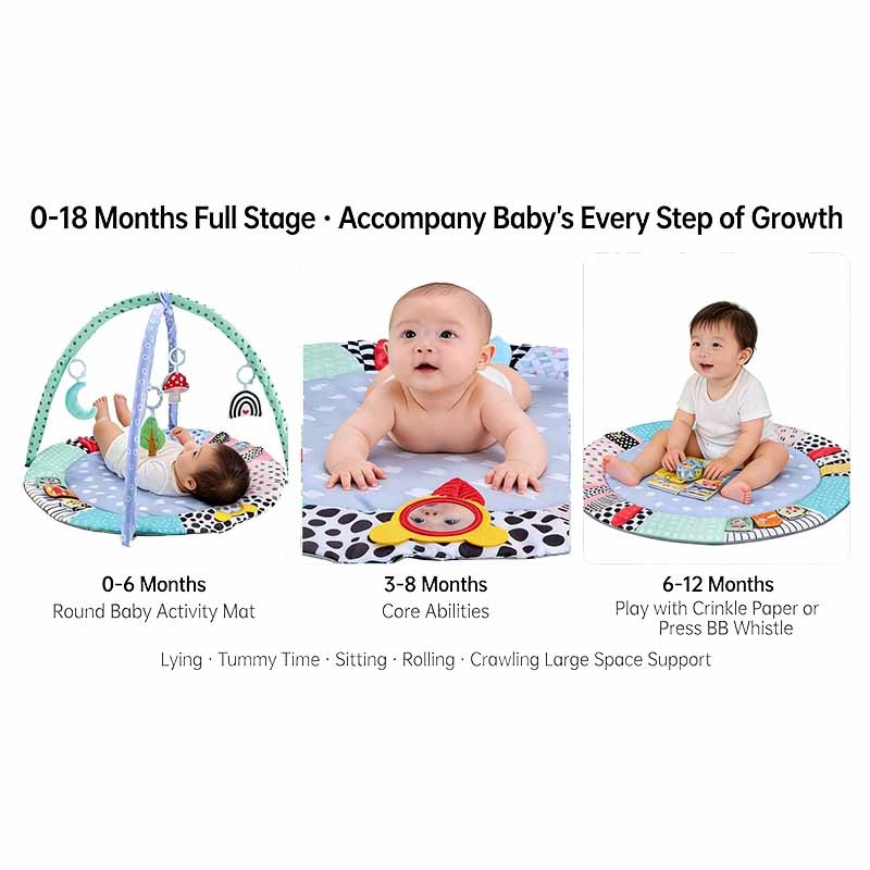 Designed for newborns to 12 months, this extra-large round Montessori play mat (85cm diameter) features a detachable gym arch and 7 interactive sensory modules – 3 hanging toys and 4 mat-based activities. Perfect for wholesale buyers and brands seeking OEM customization.