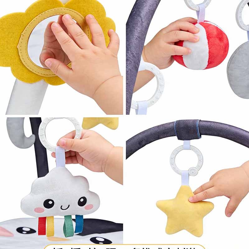 Visual stimulation – High-contrast black-white pattern, colorful toys, and safety mirror encourage focus and self-recognition.