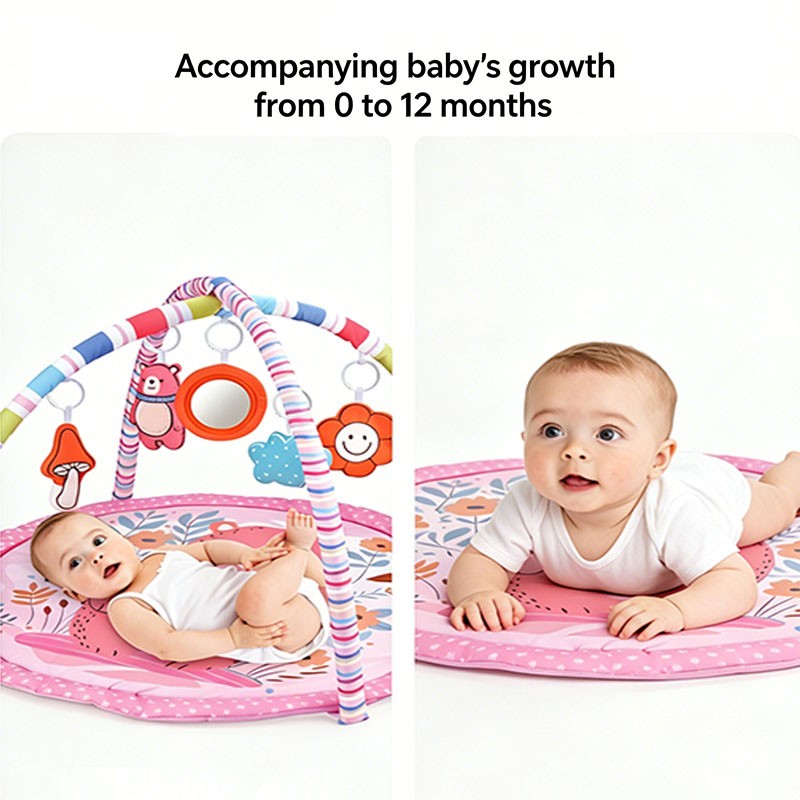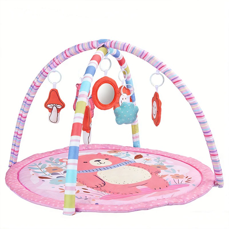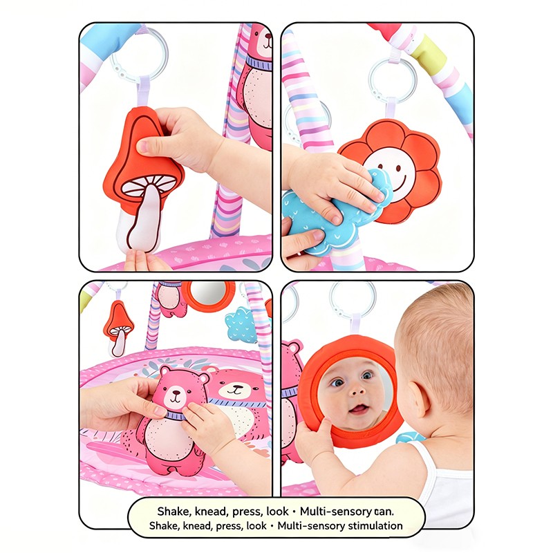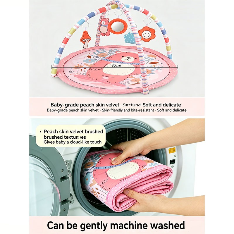 Designed for newborns to 12 months, this pink bear theme round play gym features a soft peach skin mat (85cm diameter) and 2 rainbow striped arches. Includes 5 interactive hanging toys: mushroom bell, blue cloud, pink bear squeaker, flower crinkle, and a safety mirror. Made of baby-safe peach skin fabric. Perfect for wholesale buyers and brands seeking OEM customization.