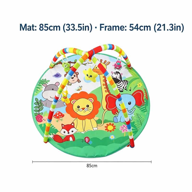 Designed for newborns to 12 months, this rainbow-striped forest animal play gym features a round peach skin mat (85cm diameter) and 2 detachable arches (54cm high). Includes 5 interactive hanging toys covering plush toys, bell and rattles. Made of baby-safe, chewable peach skin fabric. Perfect for wholesale buyers and brands seeking OEM customization.