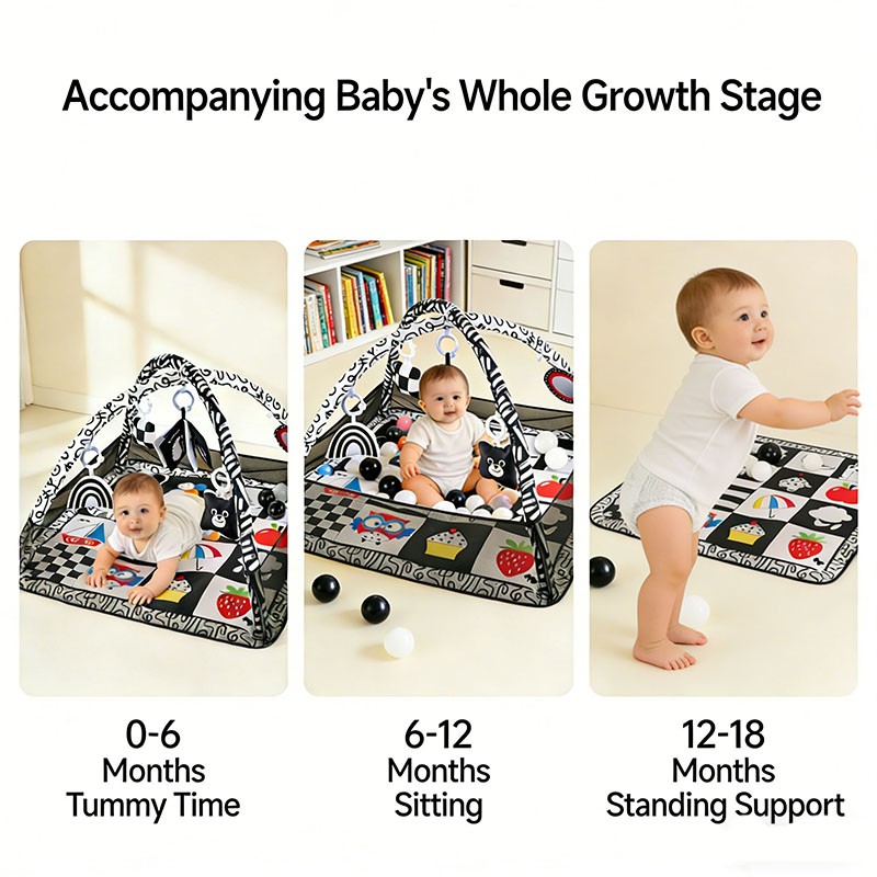 Dual-Mode Design – Ball pit mode (mesh fence raised, holds 12 balls) and flat play mat mode (fence folded under). Adapts from 0 to 18 months.