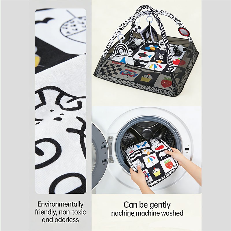 Visual stimulation – High-contrast black-white patterns + small colorful accents (apple, strawberry, rainbow) promote newborn visual development and pattern recognition.