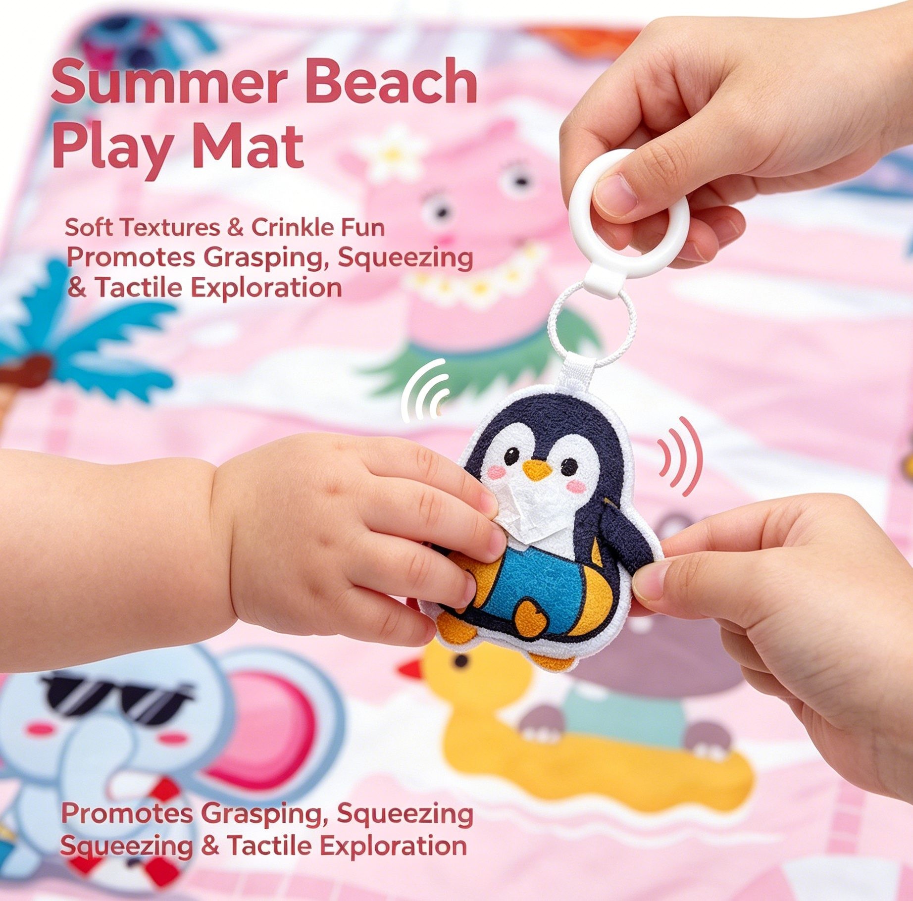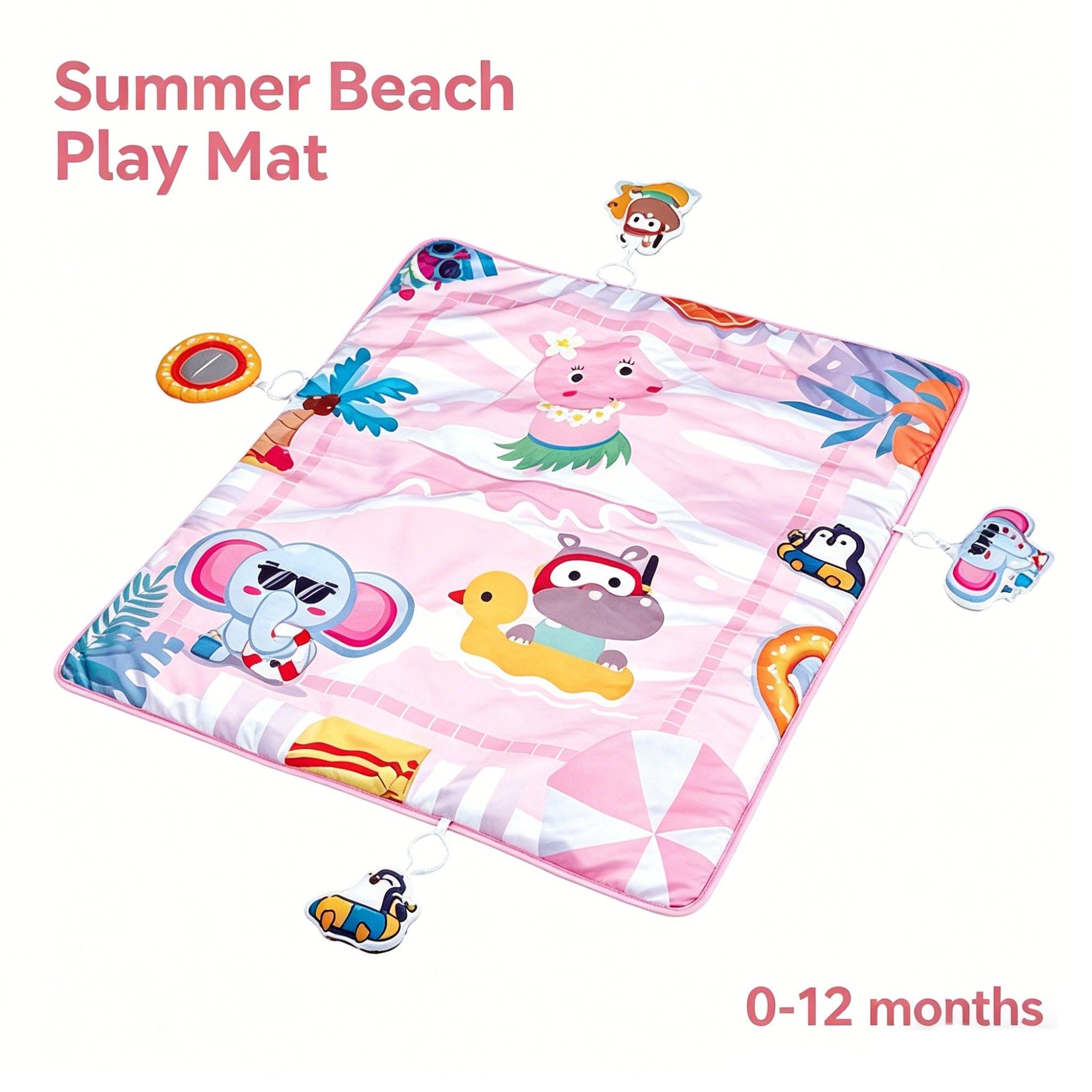 Designed for newborns to 12 months, this summer-themed square play mat measures 85cm x 76cm. The soft fabric mat features a light pink base with geometric stripes and tropical beach prints: animals wearing sunglasses, a hippo on a duck float, a pig in a grass skirt, penguins, palm trees, beach towels, and more. Four sensory toys attach to the corners via white rings: an elephant squeaker, a hippo rattle, a safety mirror, and a soft animal plush. Perfect for wholesale buyers and brands seeking OEM customization.