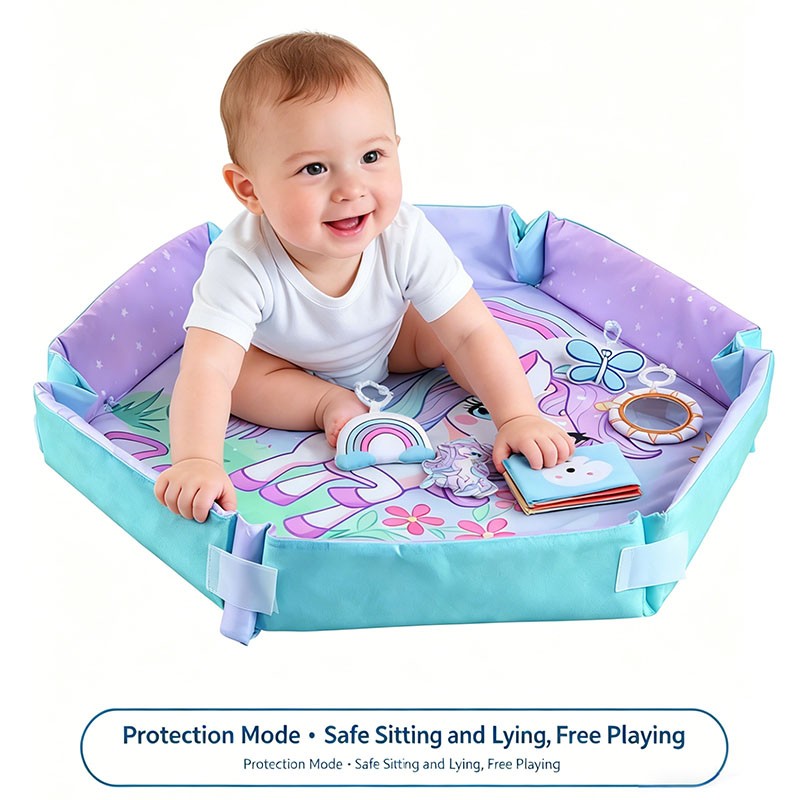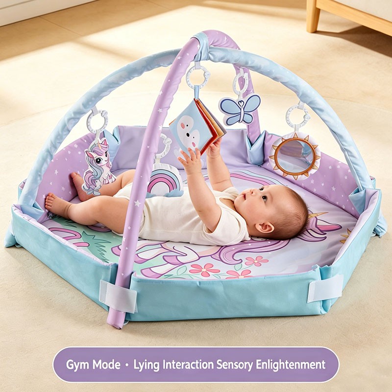 Designed for newborns to 36 months, this unicorn-themed 4-in-1 hexagon play gym features a soft padded mat (approx. 109cm x 99cm), a foldable mesh fence, 3 detachable arches, and a U-shaped tummy pillow. Includes 5 interactive hanging toys: unicorn bell, butterfly squeaker, crinkle book, rainbow teether, and safety mirror. Perfect for wholesale buyers and brands seeking OEM customization.