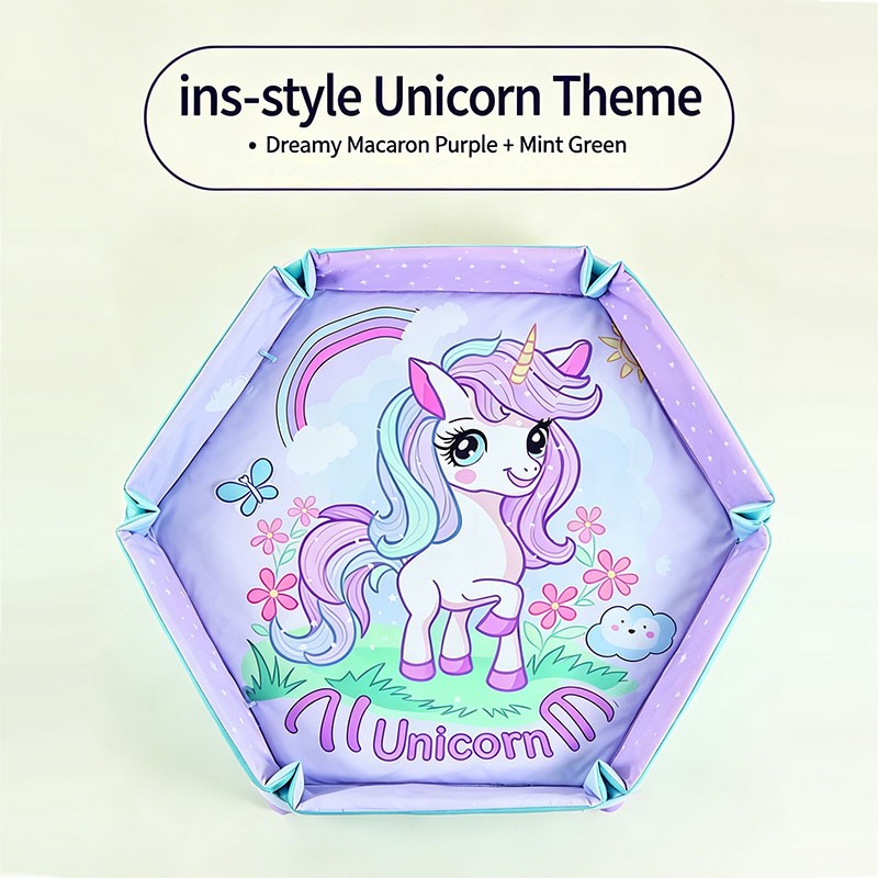 Unicorn Dream Theme – Pastel purple and mint green. Mat printed with large unicorn, butterflies, flowers, sun, clouds, rainbow, and "Unicorn" text. Fence: mint green outside, purple with white stars inside.