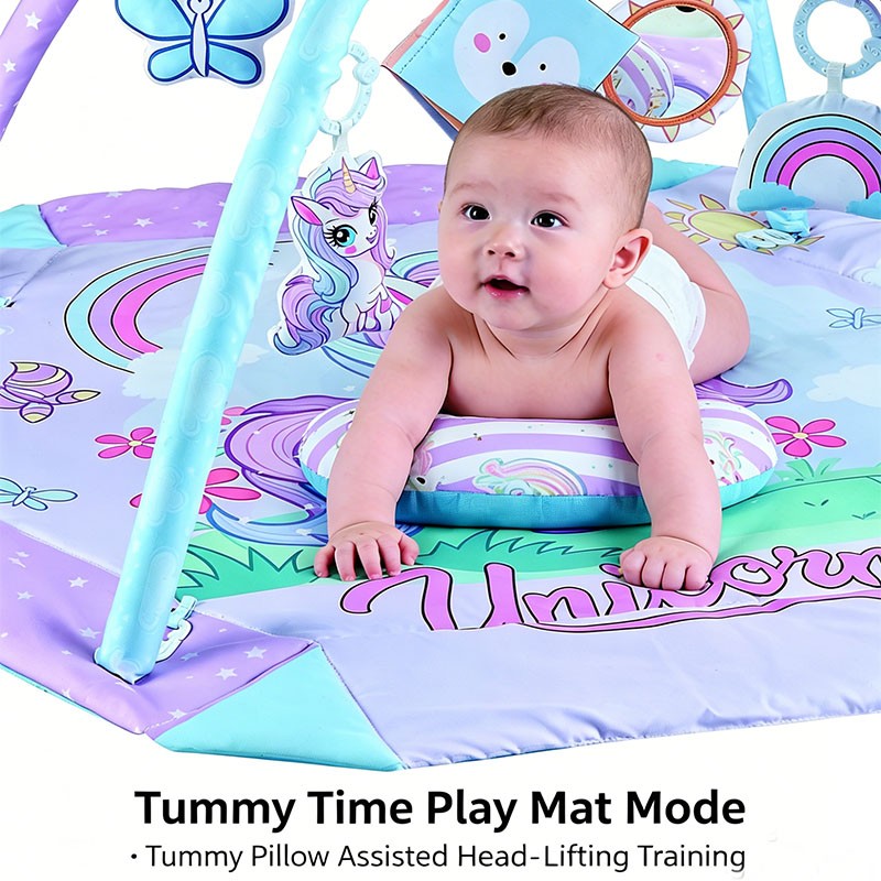 Tiny Paws unicorn theme 4-in-1 hexagon play gym. Soft mat (109x99cm), 2 detachable arches. Includes 5 toys (unicorn bell, butterfly squeaker, crinkle book, rainbow, mirror) + U-shaped tummy pillow. Foldable fence.