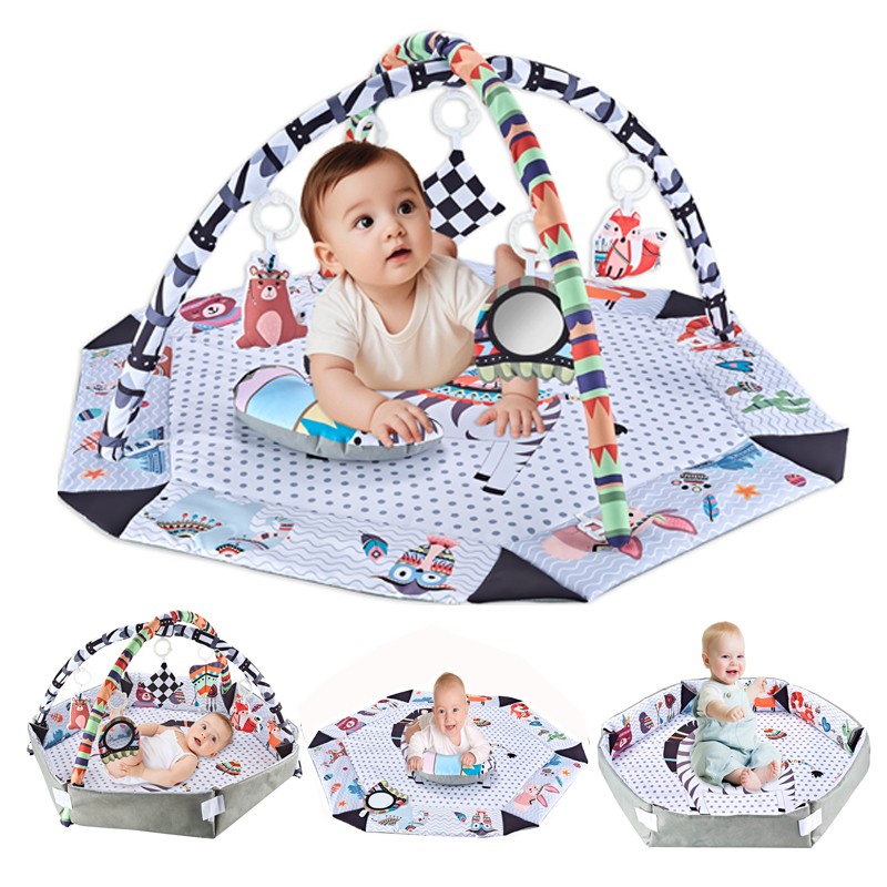 Tiny Paws 4-in-1 boho hexagon play gym with tummy pillow. 5 sensory toys (bell, squeaker, crinkle, safety mirror). Folds into playpen or ball pit. For 0-36 months. Wholesale & OEM available.