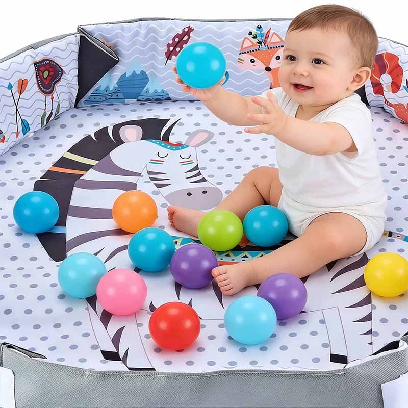 Designed for newborns to 36 months, this 4-in-1 activity center combines a play gym, tummy time mat, playpen, and ball pit into one versatile product. Features a U-shaped tummy time pillow with boho prints. Perfect for wholesale buyers and brands seeking OEM customization.