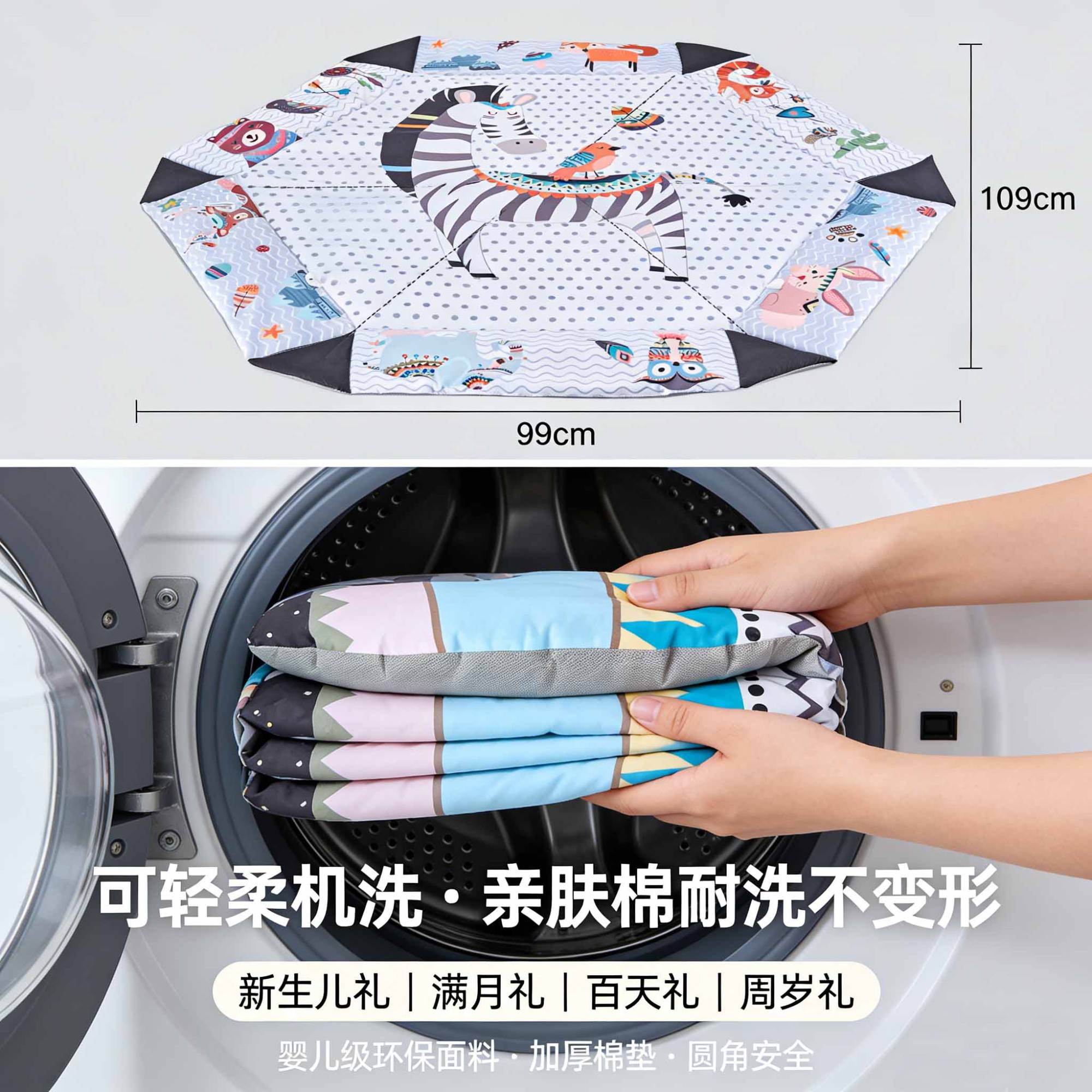 Hexagon Shape with Foldable Fences – Soft padded mat (approx. 109cm x 99cm). Velcro-secured fences can be raised for a playpen or flattened for a mat.