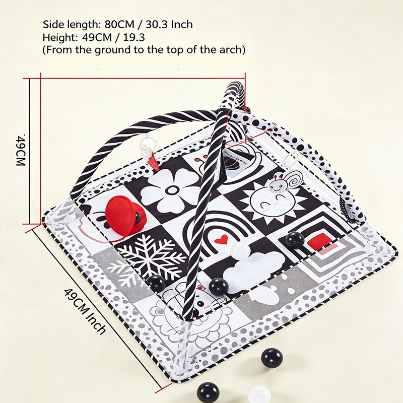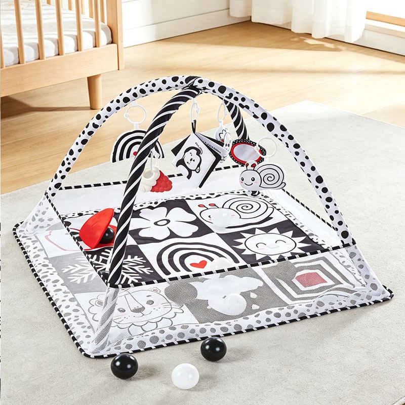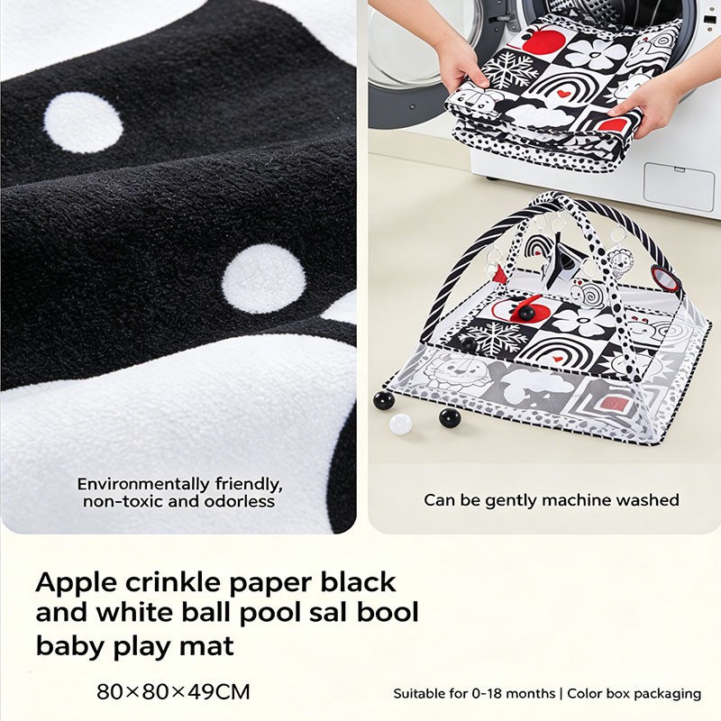 Designed for newborns to 18 months, this apple crinkle black & white play mat features a square 80x80cm base with a foldable mesh fence. Includes 6 interactive hanging toys and 12 black-white ocean balls. The fence can be raised for ball pit mode or folded flat for mat mode. Perfect for wholesale buyers and brands seeking OEM customization.