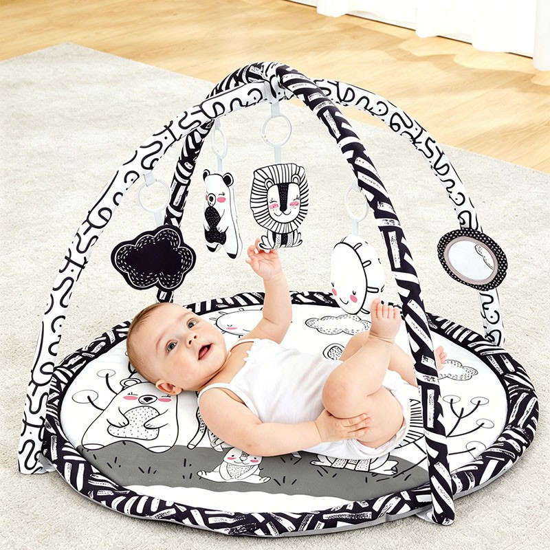 Designed for newborns to 12 months, this high contrast black white forest animal round play gym features a soft peach skin mat (85cm diameter) and 2 detachable arches. Includes 4 interactive toys: lion bell, black cloud crinkle, bear squeaker, sun teether, plus a safety mirror. Perfect for wholesale buyers and brands seeking OEM customization.