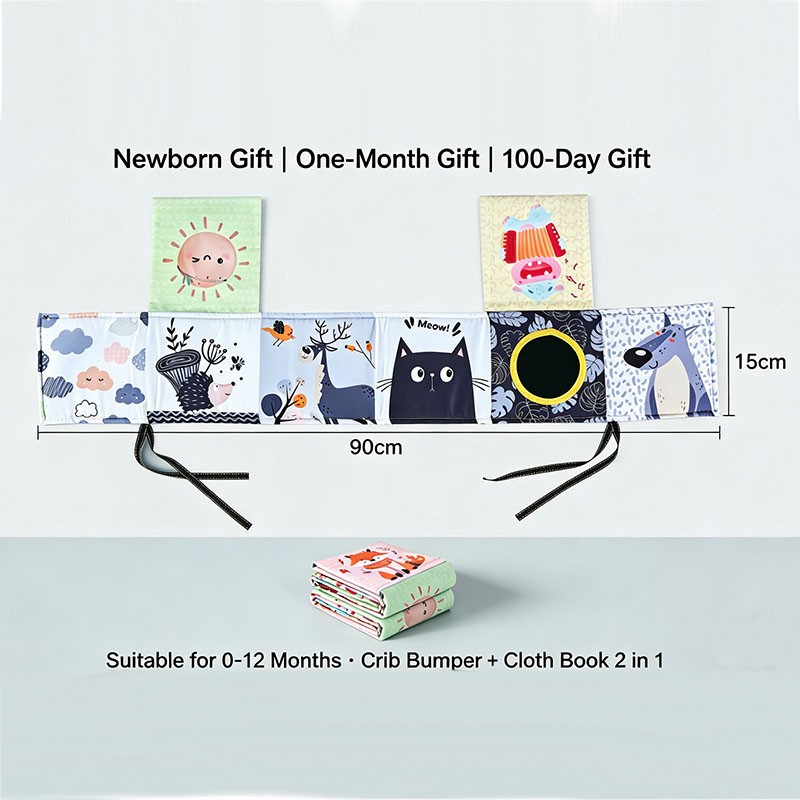 Tiny Paws forest animal crib bumper & cloth book. 90x15cm, double-sided (color + black-white). Features: crinkle tree, squeaker hippo, safety mirror.