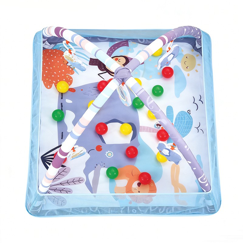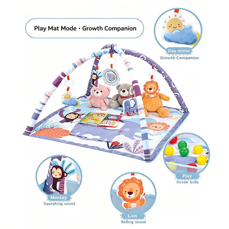 Designed for newborns to 12 months, this fresh blue forest animal 2-in-1 play gym and ball pit features a square mat with breathable mesh fence (foldable) and 2 pastel striped arches. Includes 5 interactive hanging toys: elephant squeaker, lion bell, cloud soft touch, monkey bell, and a safety mirror. Perfect for wholesale buyers and brands seeking OEM customization.