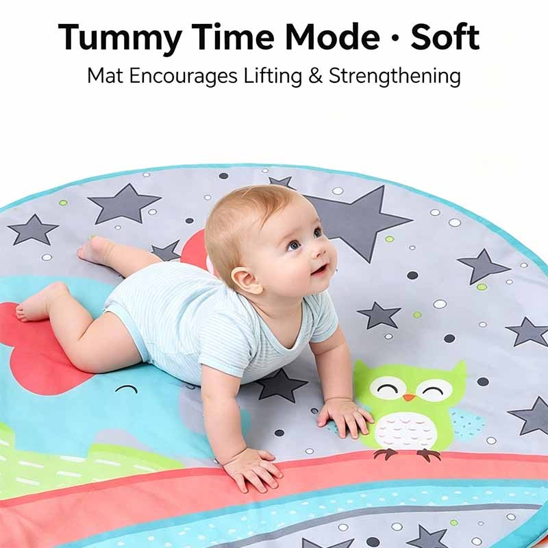 Visual stimulation – High-contrast grey dots, stars, and colorful animal prints enhance focus.