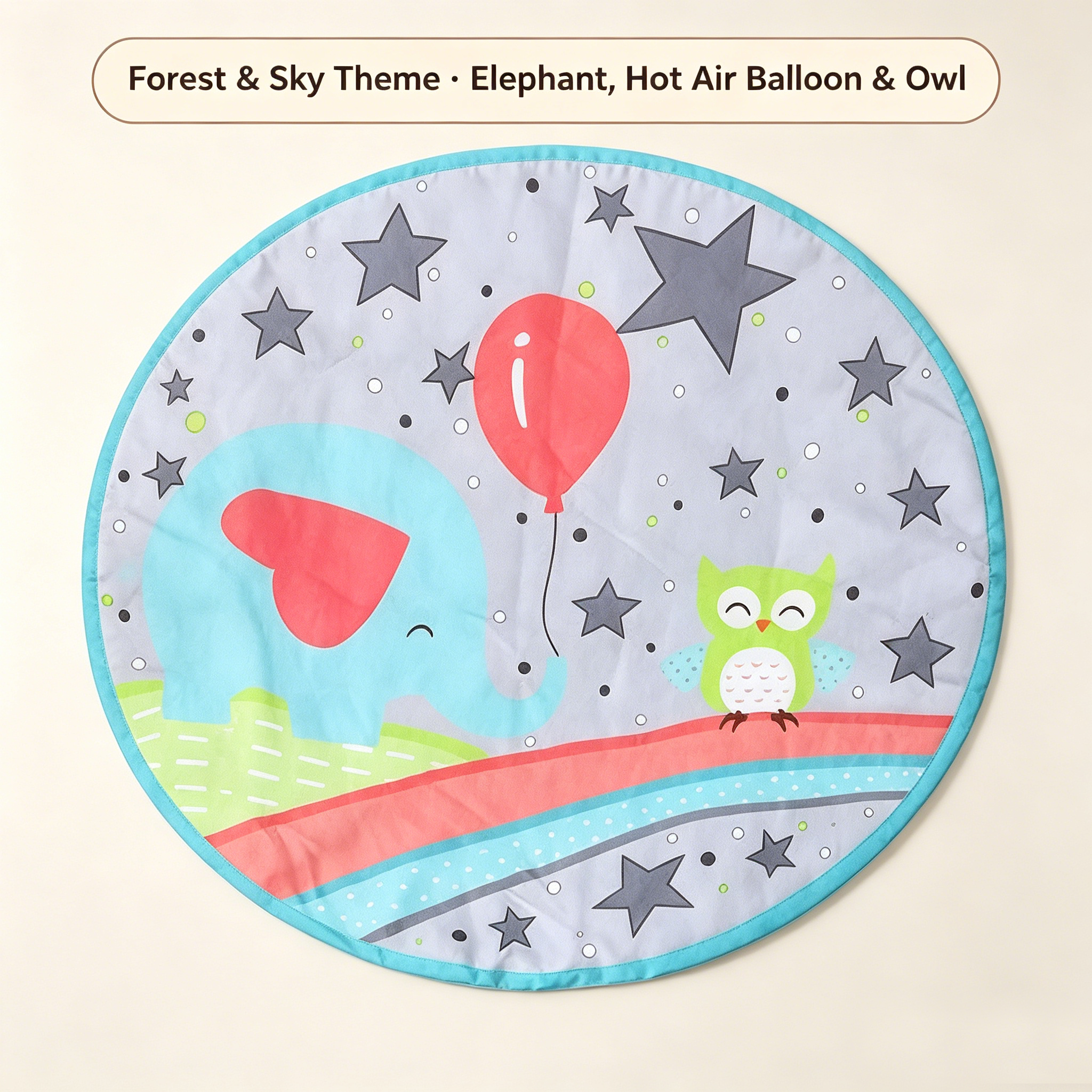 Grey Dot Forest Theme – Light grey mat with dark grey stars and white dots. Features elephant, hot air balloon, owl, and rainbow waves. Soft, calming, gender-neutral.