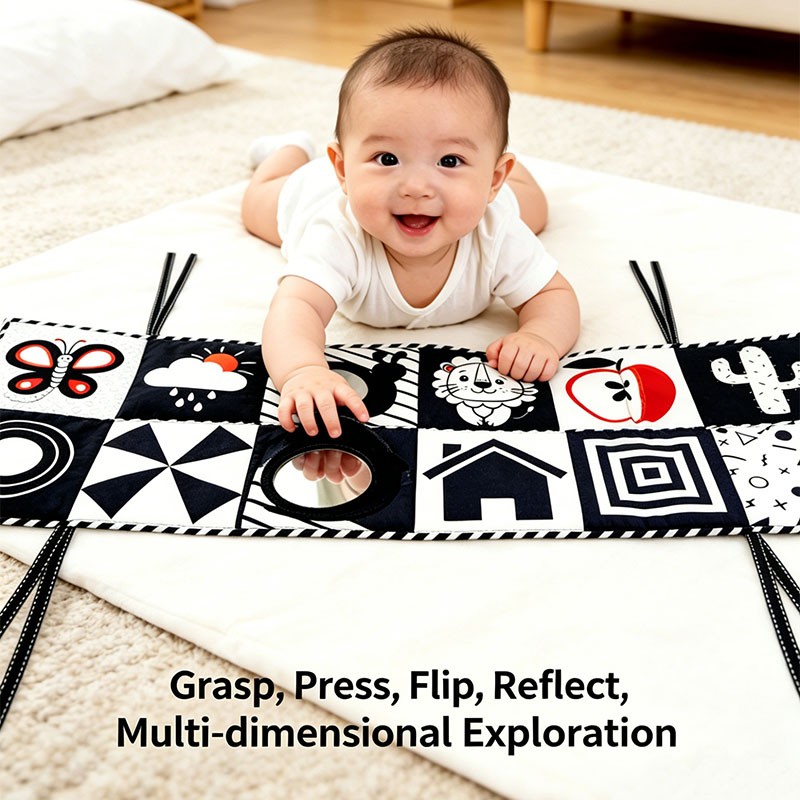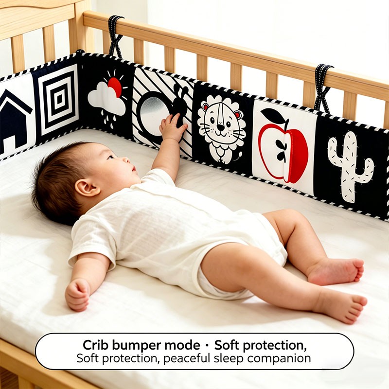 Designed for newborns to 12 months, this double-sided crib bumper and cloth book measures 80x15cm. The front features high-contrast black-white-red animal prints with an apple crinkle flap, snail safety mirror, and built-in squeaker. The reverse side offers black-white geometric patterns for early visual stimulation. Perfect for wholesale buyers and brands seeking OEM customization.
