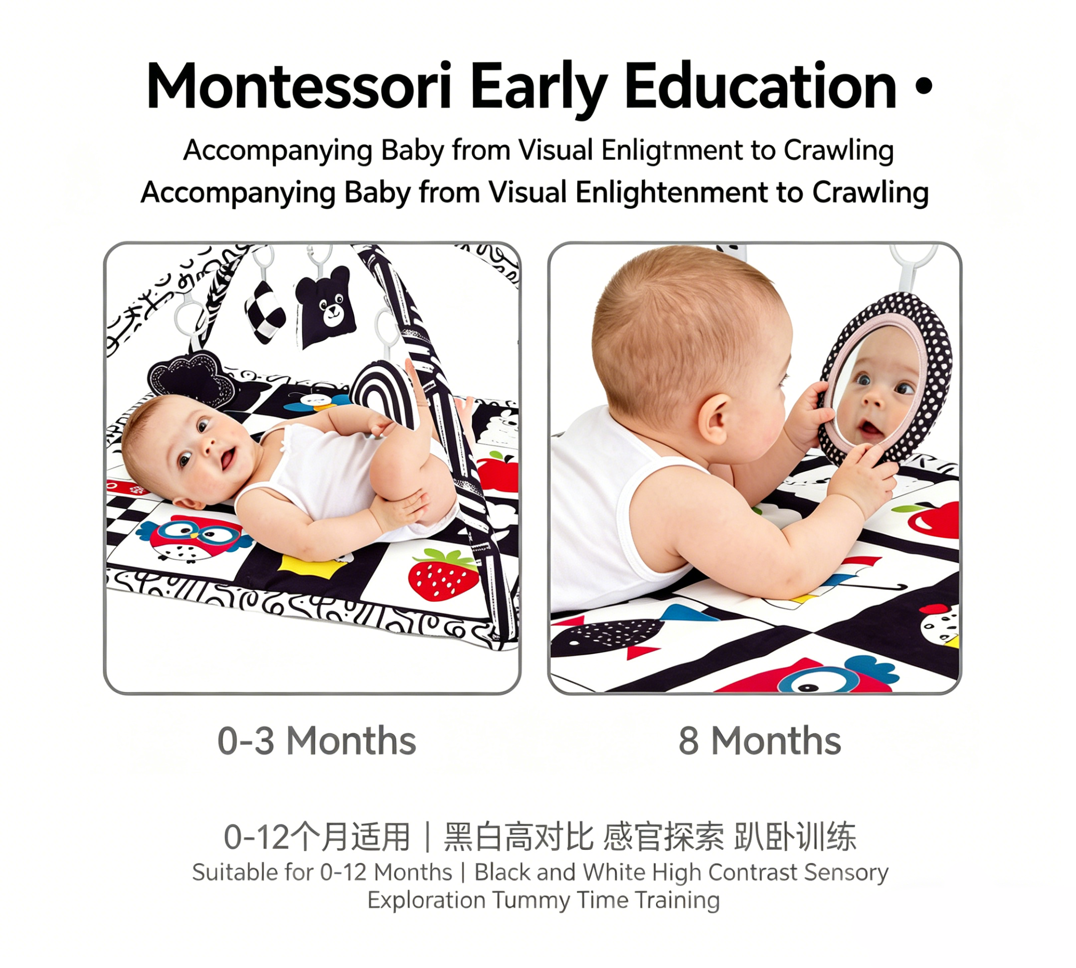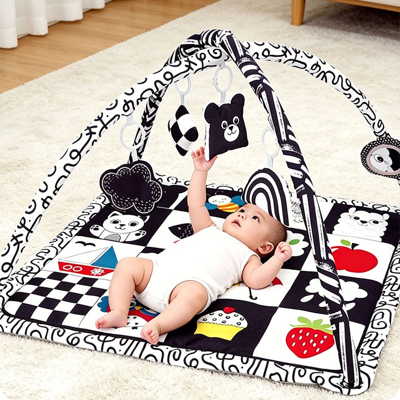 Designed for newborns to 12 months, this high contrast Montessori square play gym features a black-white checker peach skin mat (85cm) and 2 detachable arches. Includes 5 interactive toys: geometric bell, black cloud crinkle, bear squeaker, rainbow, and a safety mirror. Perfect for wholesale buyers and brands seeking OEM customization.