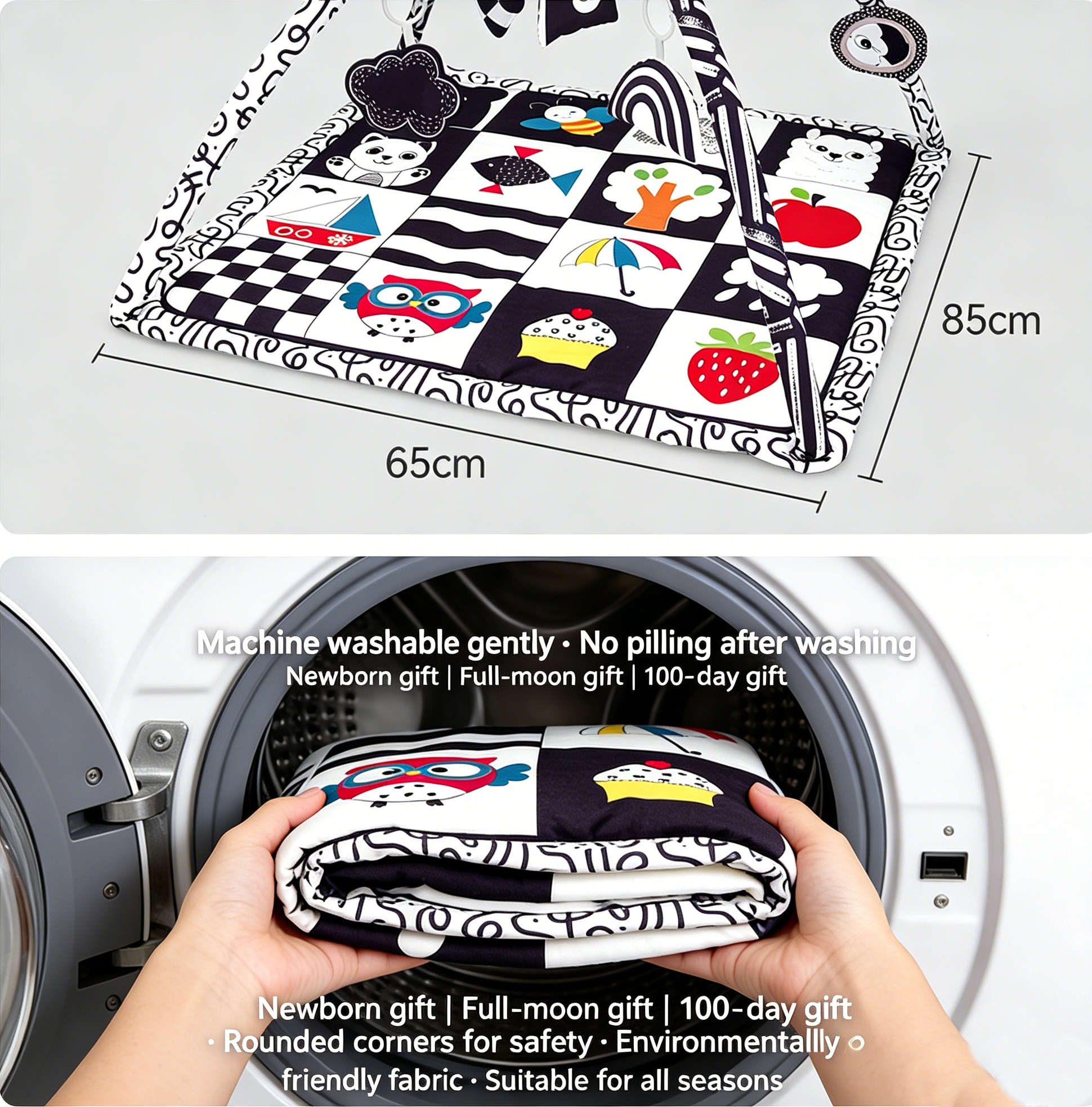 Black-white checker peach skin mat (85cm), 2 arches. 5 toys: geometric bell, black cloud crinkle, bear squeaker, rainbow, mirror.