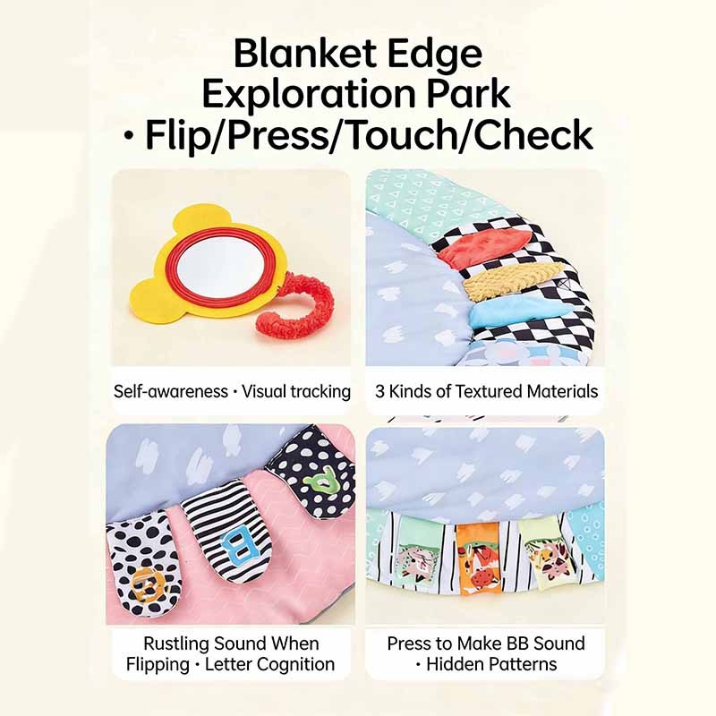 4 Interactive Mat Features – Animal flip pages with squeaker; ABC geometric crinkle strip; three-color tactile ribbons (red: bumpy, yellow: textured, blue: smooth); yellow bear-head safety mirror with elastic strap.