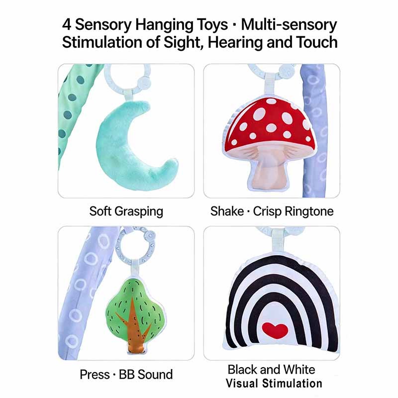 4 Hanging Sensory Toys – Includes red mushroom bell (ringing), green tree squeaker (squeaking sound), light blue moon (super soft fabric), and High contrast rainbow.