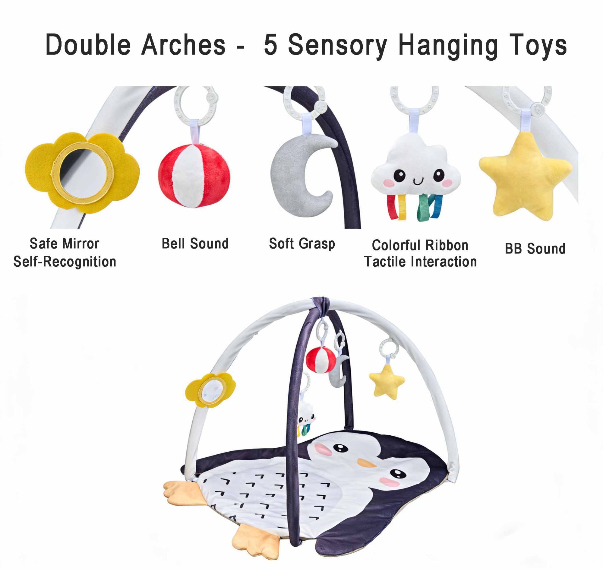 Tiny Paws penguin-shaped 2-in-1 play mat & gym. Super soft fabric with anti-slip base.