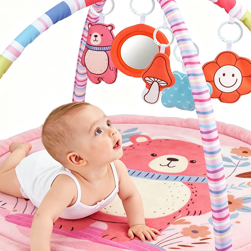Designed for newborns to 12 months, this pink bear theme round play gym features a soft peach skin mat (85cm diameter) and 2 rainbow striped arches. Includes 5 interactive hanging toys: mushroom bell, blue cloud, pink bear squeaker, flower crinkle, and a safety mirror. Made of baby-safe peach skin fabric. Perfect for wholesale buyers and brands seeking OEM customization.