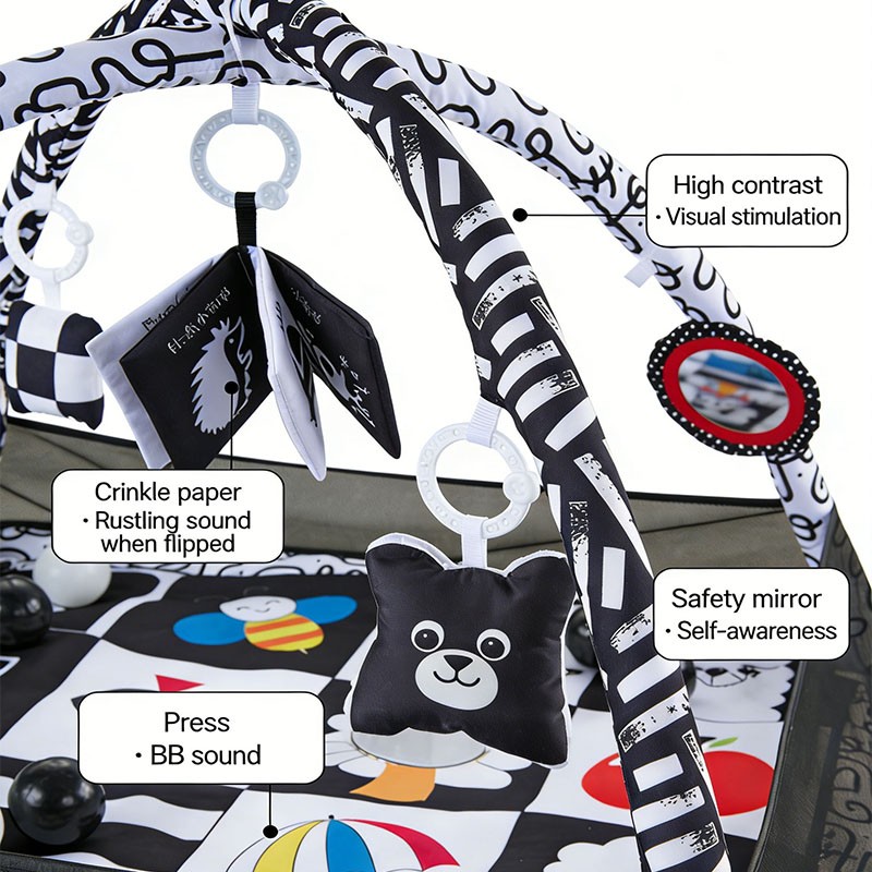 | Material | Polyester fabric, breathable mesh, high-elastic PP cotton fill, Fiberglass arch, non-toxic plastic crinkle/rattle/squeaker, acrylic mirror, PE balls |
