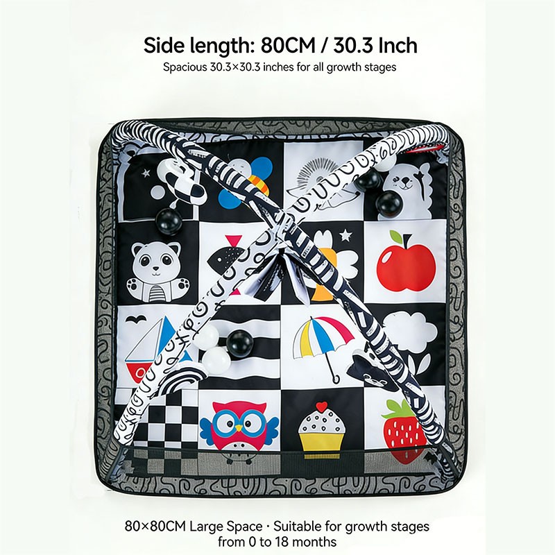 High-Contrast Black & White Theme – Square mat (80x80cm / 30.3x30.3 inches) with black-white checkers, geometric shapes, fish, umbrella, owl, cupcake, strawberry, apple, and rainbow. Colorful accents for visual stimulation.