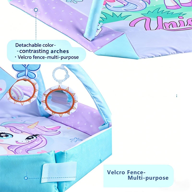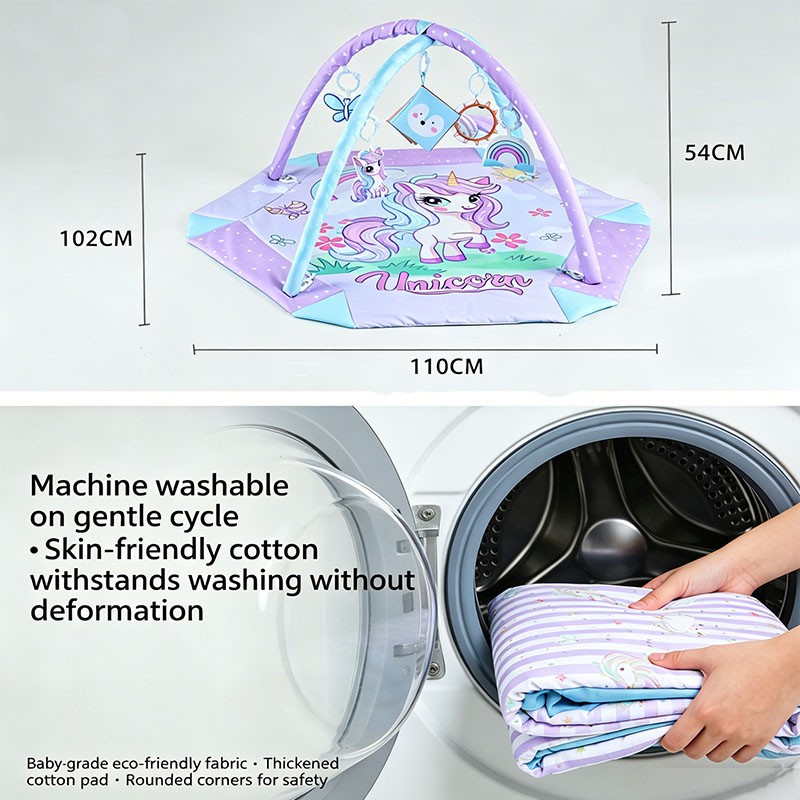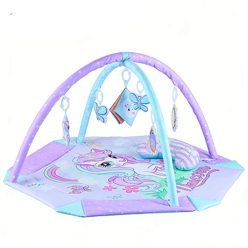 Designed for newborns to 36 months, this unicorn-themed 4-in-1 hexagon play gym features a soft padded mat (approx. 109cm x 99cm), a foldable mesh fence, 3 detachable arches, and a U-shaped tummy pillow. Includes 5 interactive hanging toys: unicorn bell, butterfly squeaker, crinkle book, rainbow teether, and safety mirror. Perfect for wholesale buyers and brands seeking OEM customization.